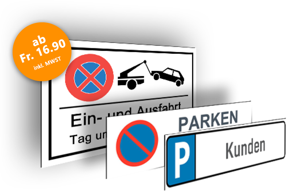 Wir bieten schweizweit Tiefstpreisgarantie für bedruckte Parkplatzschilder.